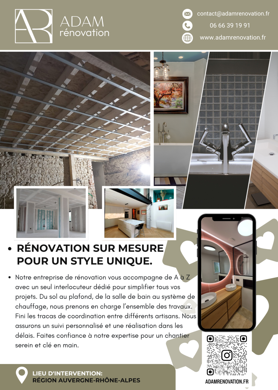 - Notre entreprise de rénovation vous accompagne de A à Z avec un seul interlocuteur dédié pour simplifier tous vos projets. Du sol au plafond, de la salle de bain au système de chauffage, nous prenons en charge l’ensemble des travaux. Fini les tracas de coordination entre différents artisans dans la région rhone alpes . Nous assurons un suivi personnalisé et une réalisation dans les délais. Faites confiance à notre expertise pour un chantier serein et clé en main.